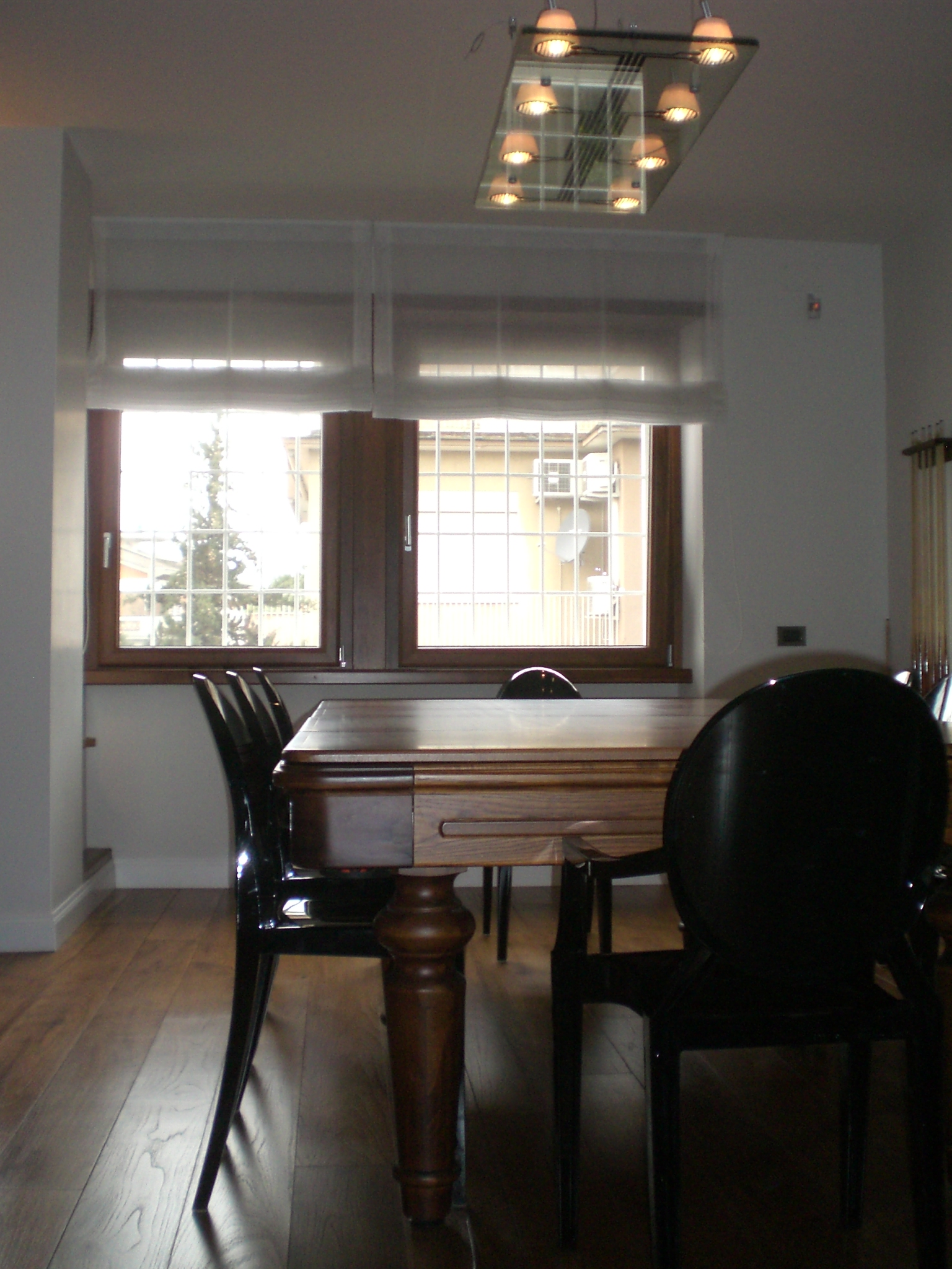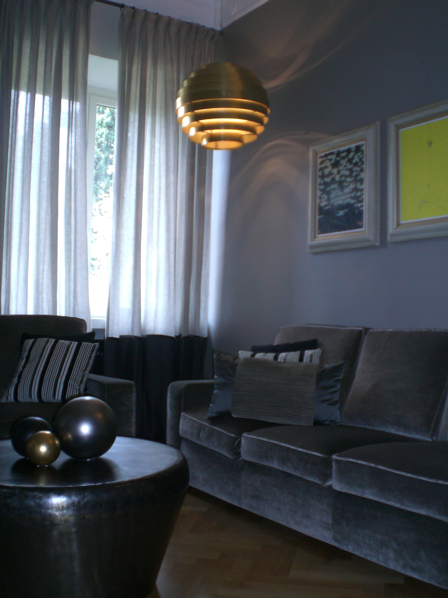 La grande sospensione che campeggia al centro della stanza è realizzata su misura in tessuto plissettato che ripete i colori degli arredi. Le sue forme morbide sdrammatizzano il colore nero. Per case molto di stile.