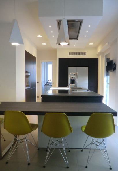 L’angolo colazione è illuminato da un gioco di spigoli e specchi ottenuti da un sottile foglio di alluminio piegato: le lampade Vertigo di Fontana Arte non sfigurano in questa cucina ipertecnologica.