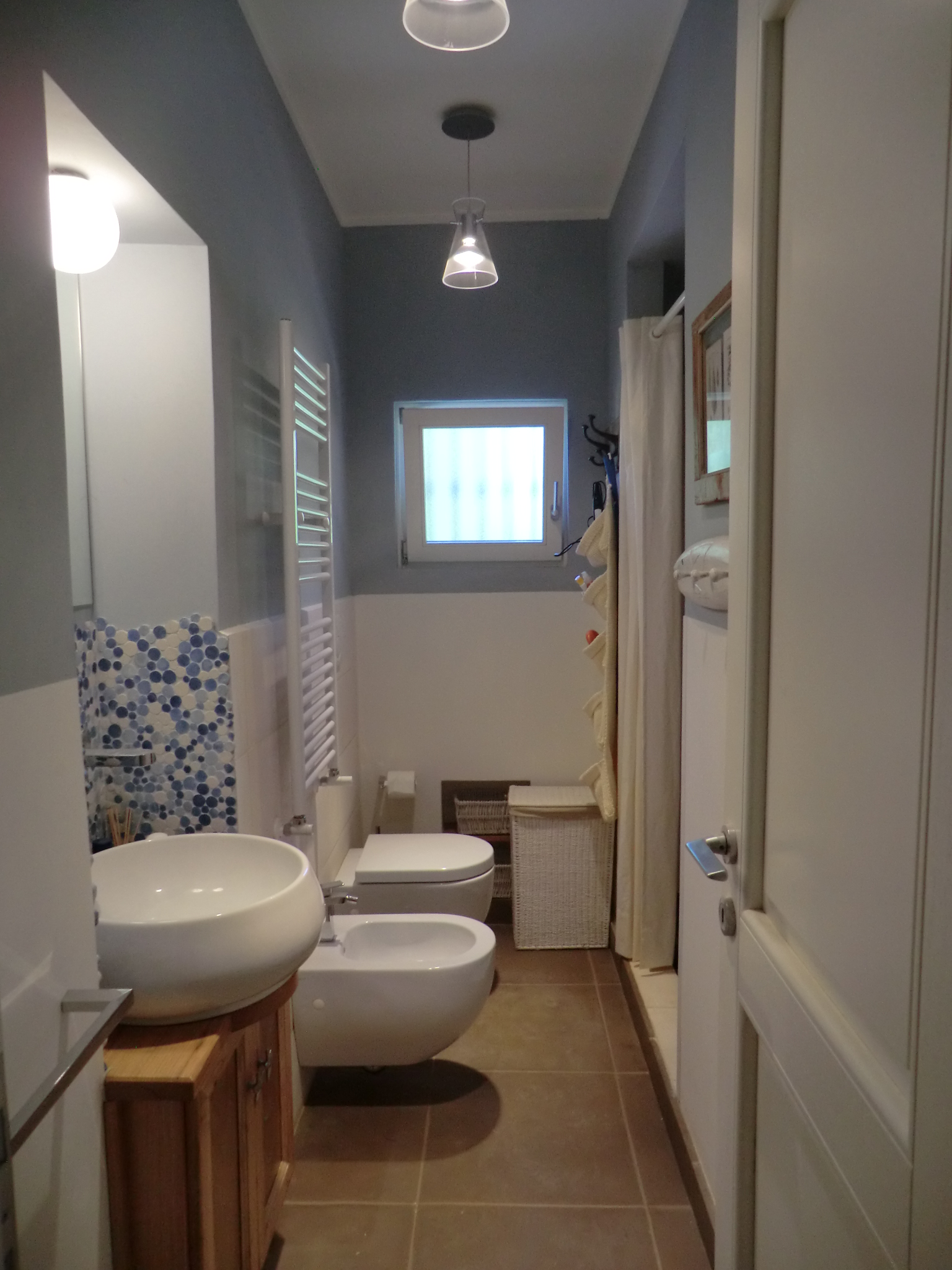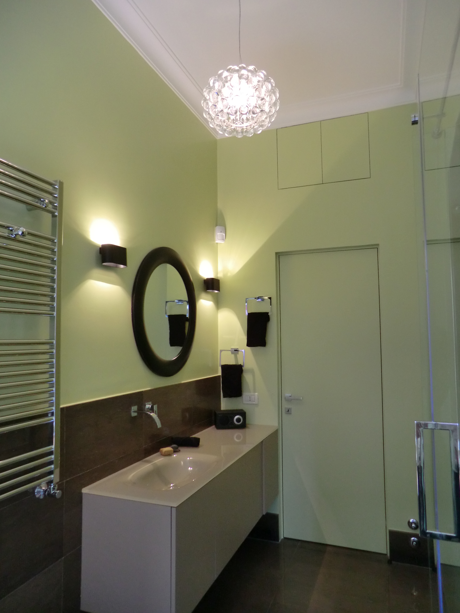 La scintillante versione contemporanea del lampadario in cristallo ha 189 sfere in metacrilato: Caboche di Foscarini deve il suo nome al tipico taglio di diamante; l’abbiamo utilizzata come luce centrale della stanza da bagno per sottolinearne tutta l’ironia e l’eleganza.