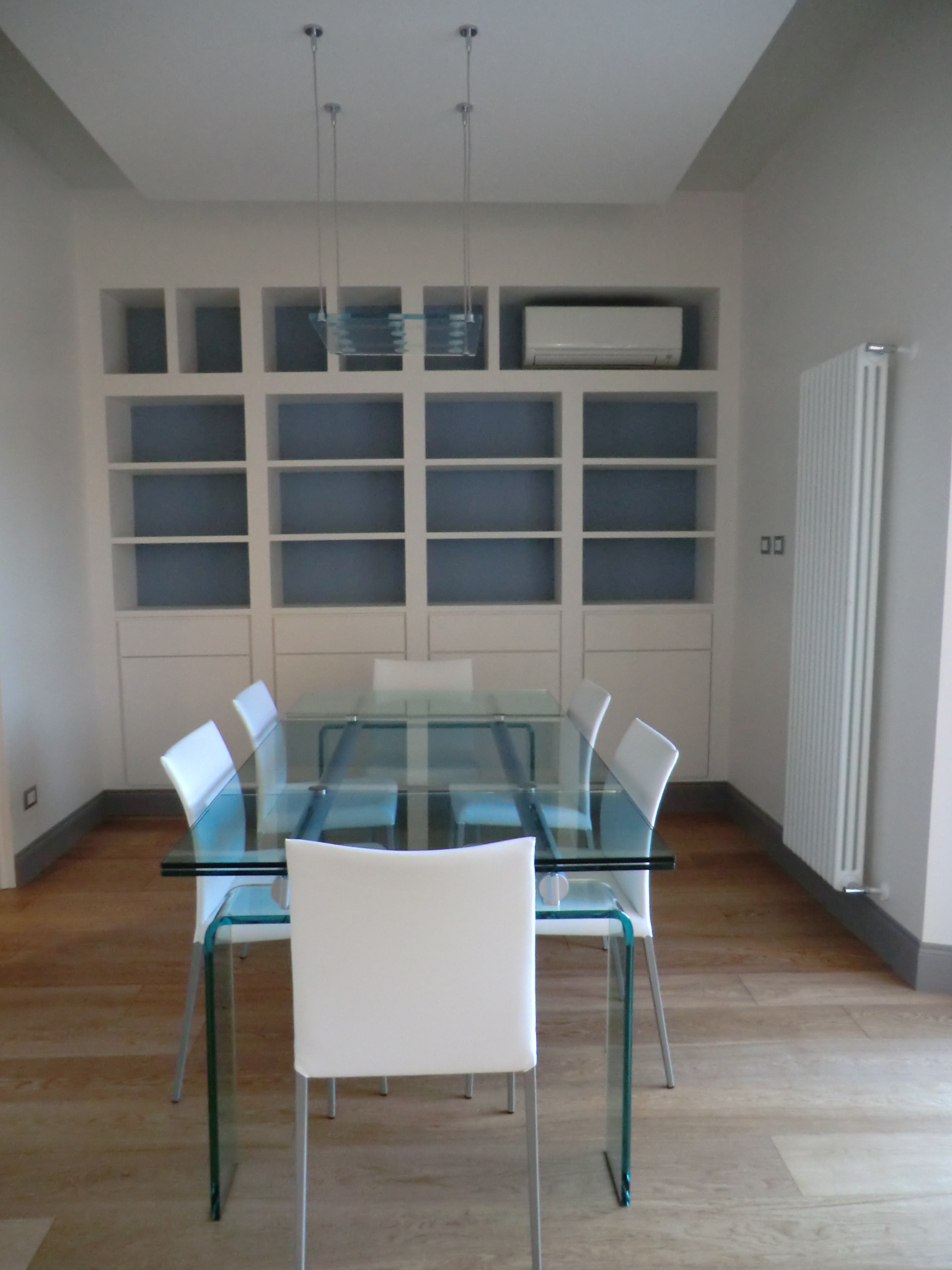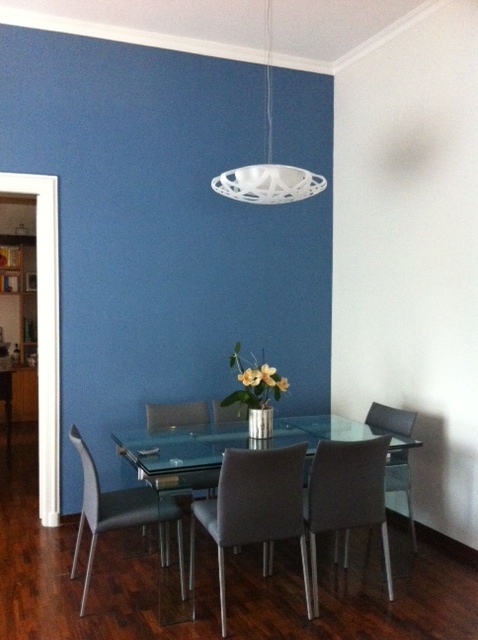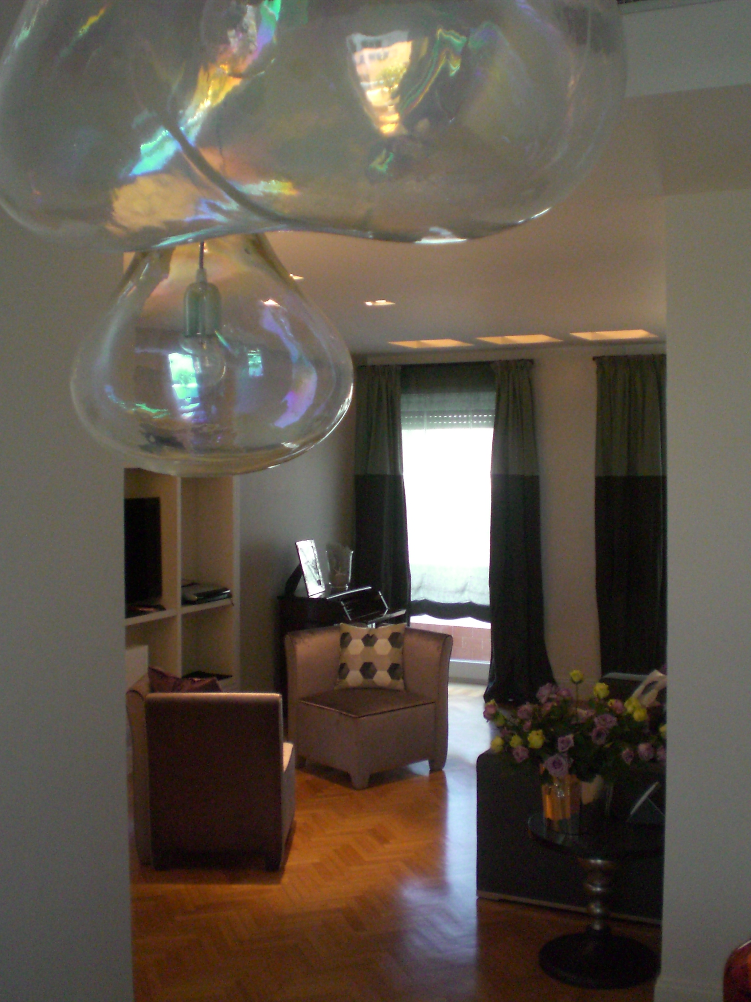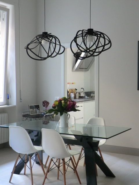 L’iridescenza del vetro soffiato e la forma ricorda quella delle bolle di sapone adattandosi magnificamente ad ambienti e stili diversi dal classico al contemporaneo. la Bolla di FontanArte è qui inserita in entrambi i formati disponibili sul tavolo del pranzo.