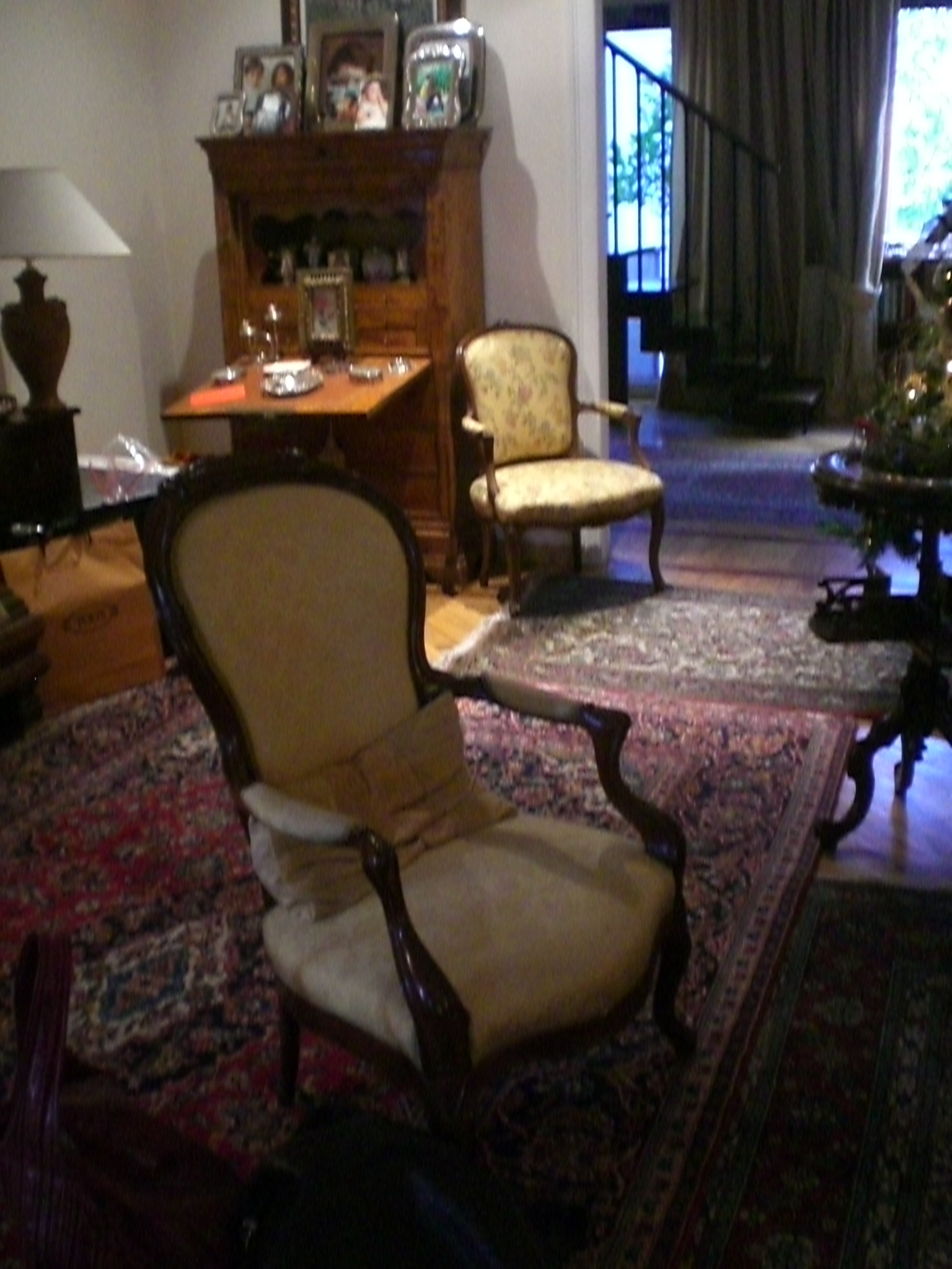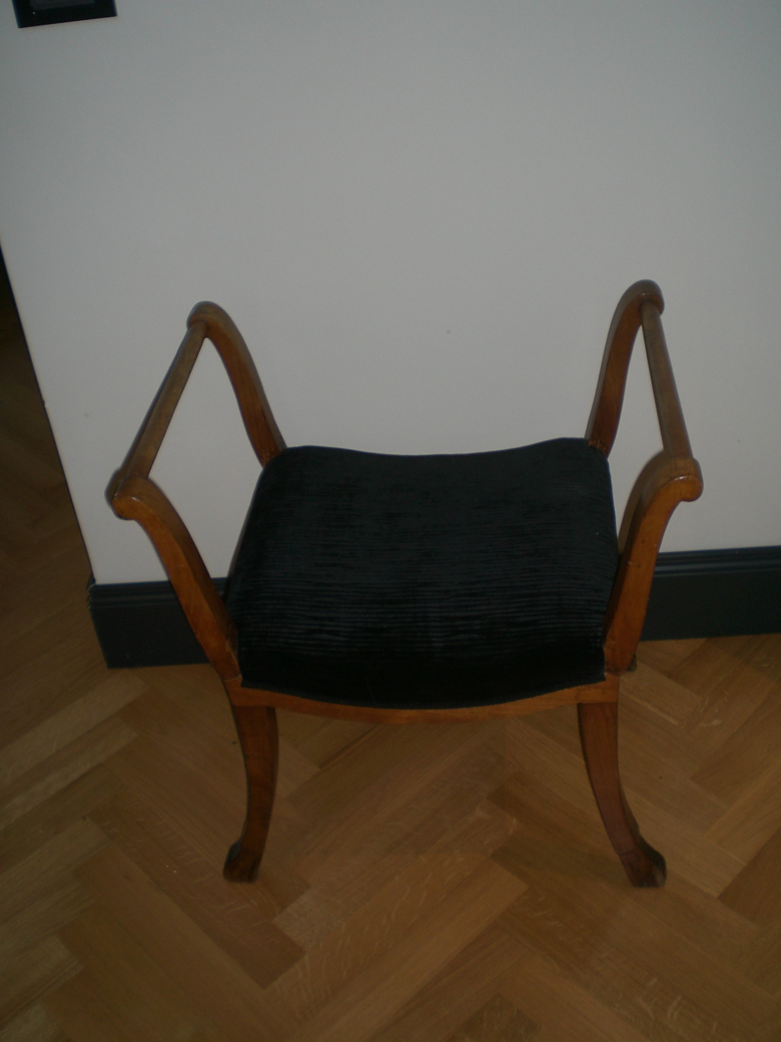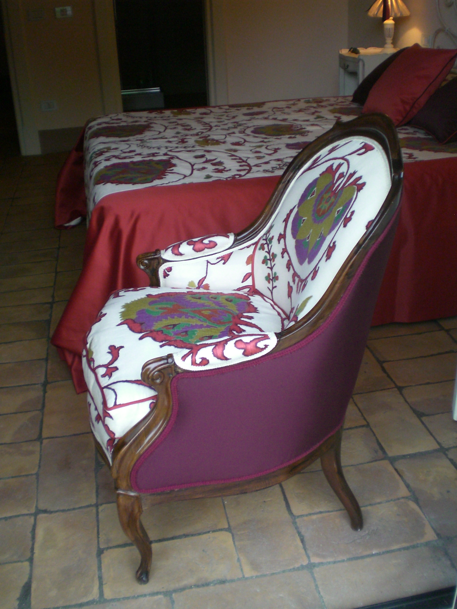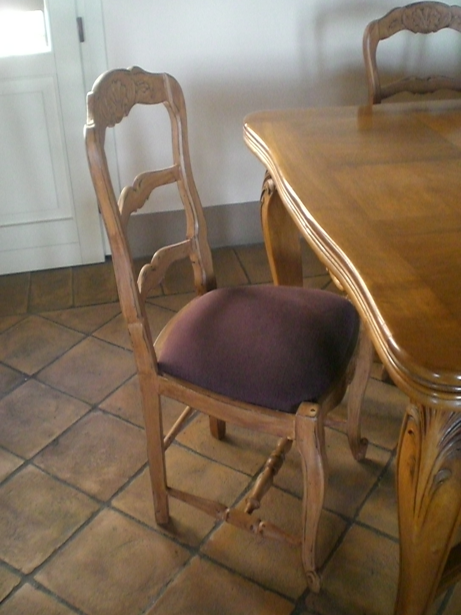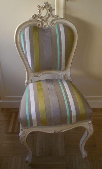Ecco i passaggi che questa vecchia sedia ha subito prima di sposarsi ad un tavolo in noce: schiaritura del legno in un tono più “caldo”, nuova imbottitura e rivestimento con un tessuto color melanzana