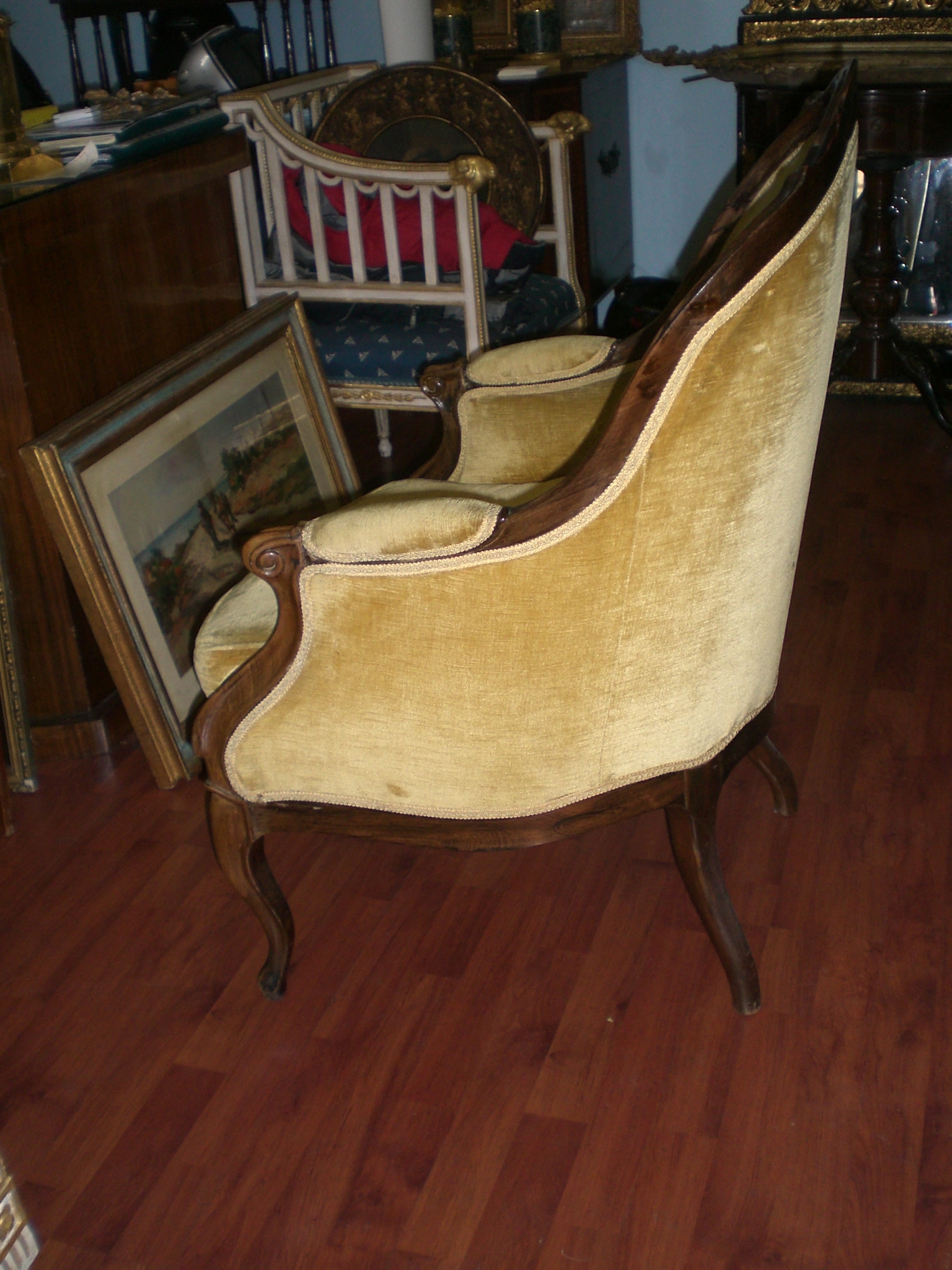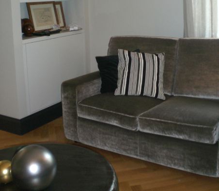 Per dare un taglio più attuale al vecchio divano abbiamo modificato il bracciolo squadrandolo ; il rivestimento in velluto grigio ne ha completato la trasformazione!