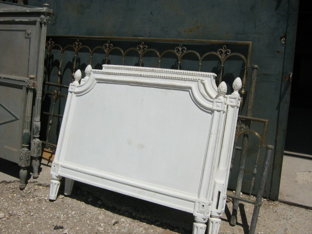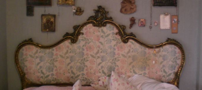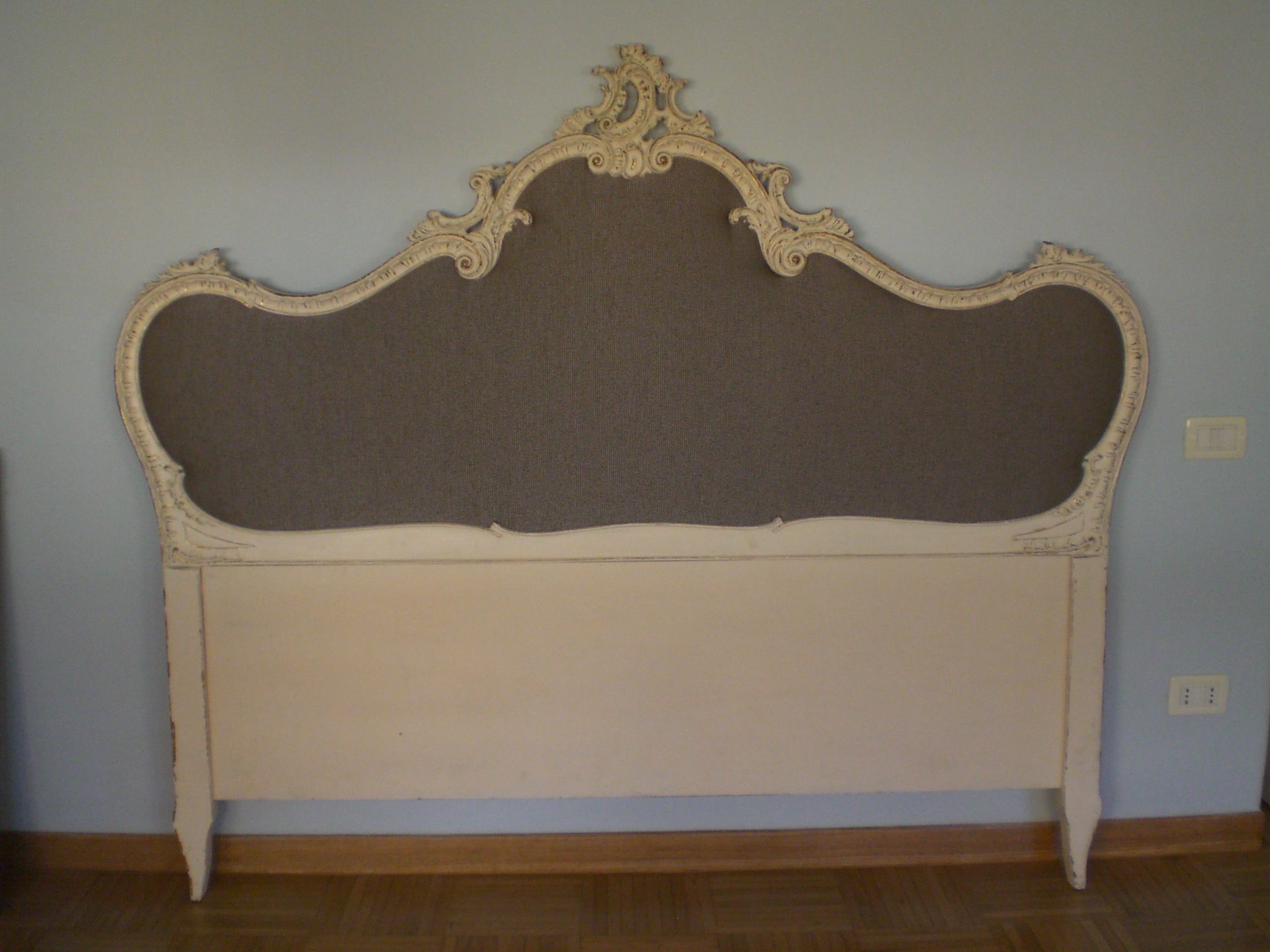 L’oro affiora appena qua e là sotto la patina di bianco e le pennellature color tortora, coordinandosi con il nuovo tessuto dell’imbottitura. Per far risaltare maggiormente la testata abbiamo ridipinto la parete dietro il letto con un celeste pallido