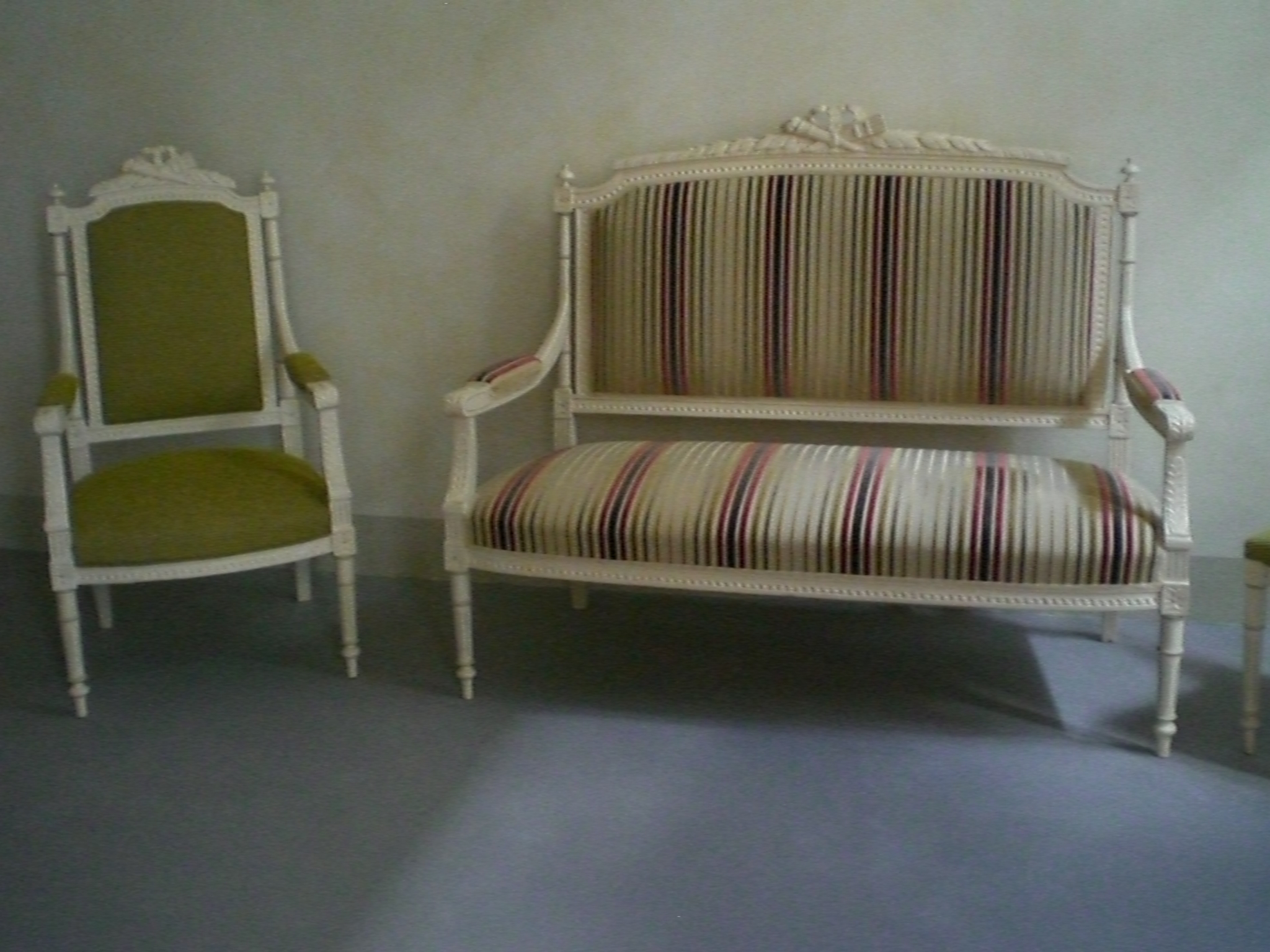 Anche questo divanetto aveva bisogno di un nuovo look; abbiamo sbiancato le parti in legno, poi righe a colori vivaci gli hanno ridato energia! Il pavimento è stato ricoperto con della resina color cemento.