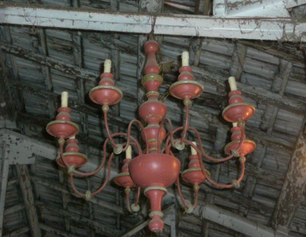 Il vecchio lampadario in legno di stile tirolese, ridipinto con tinte più sobrie è al centro della cucina-pranzo nella casa di campagna in Toscana