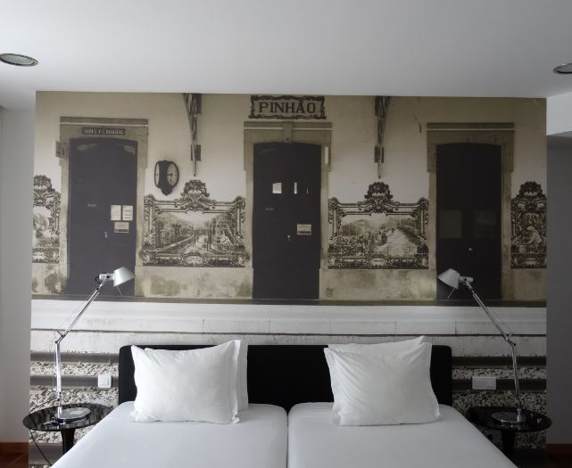 La gigantografia della vecchia stazione di Pinhao (Portogallo) personalizza la testata del letto in questo hotel di design
