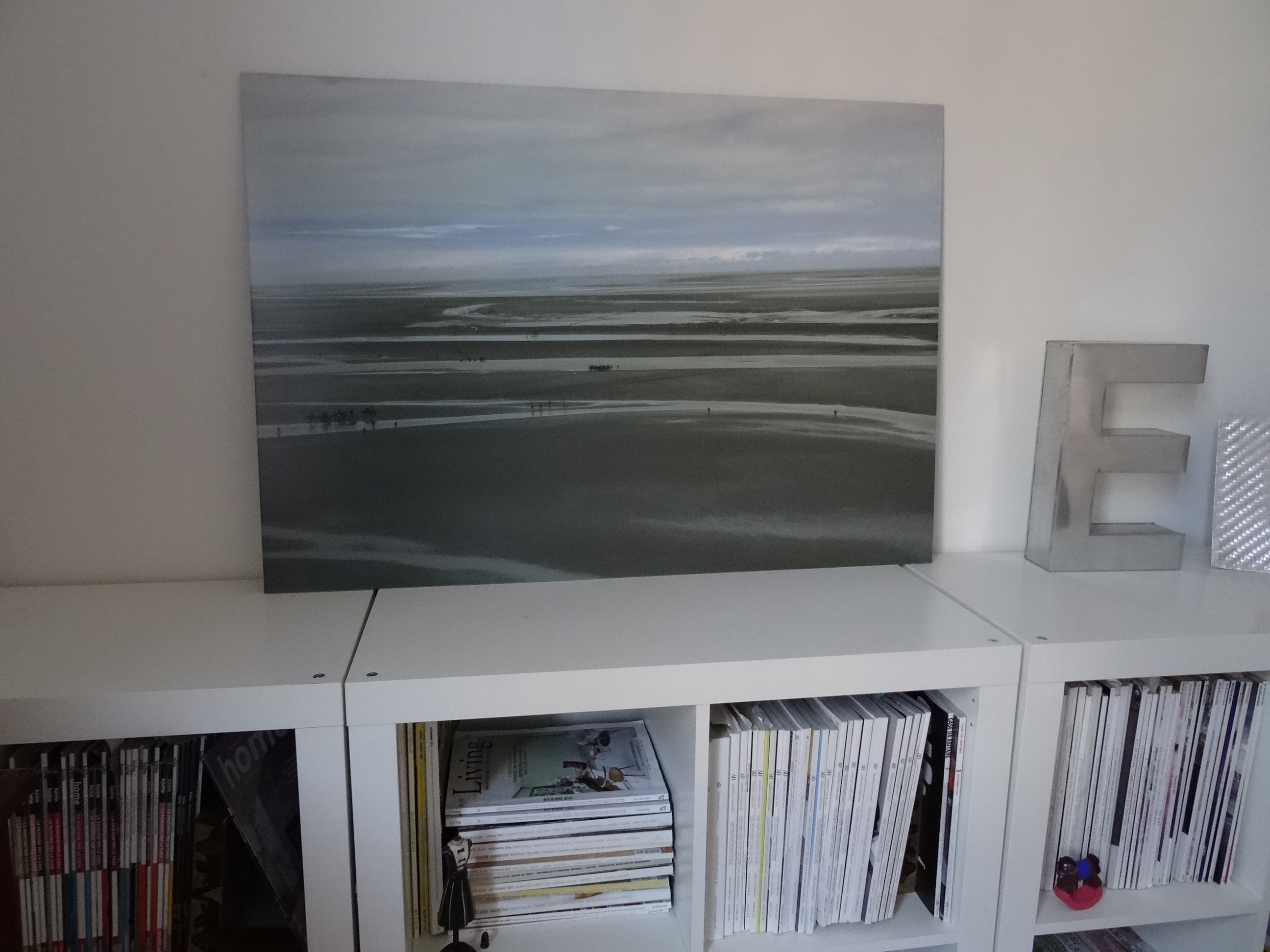 Nell’angolo studio la foto di una bassa marea nell’Atlantico è stampata direttamente su acciaio