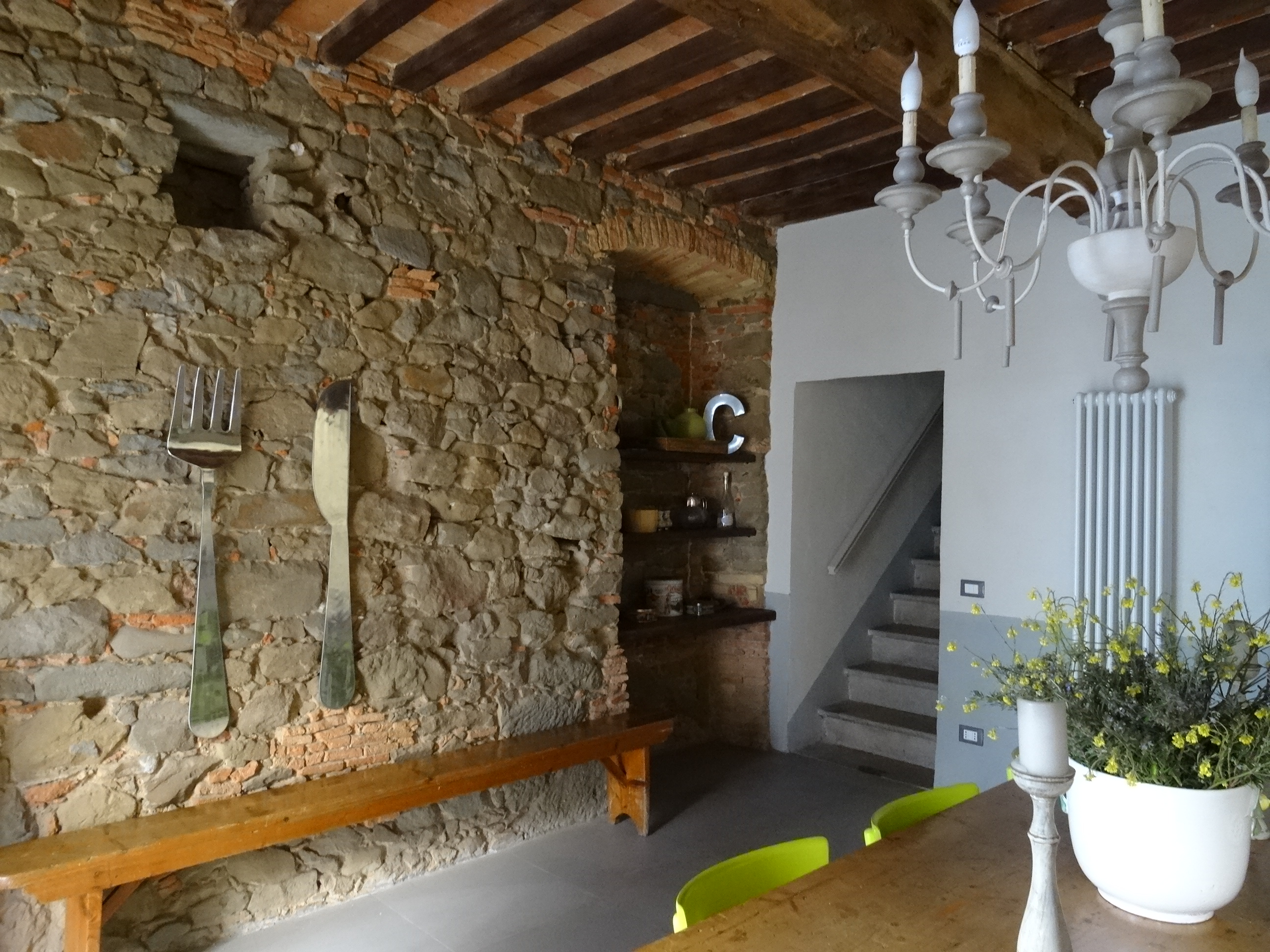 Nella zona pranzo: due maxi posate sulla parete in pietra