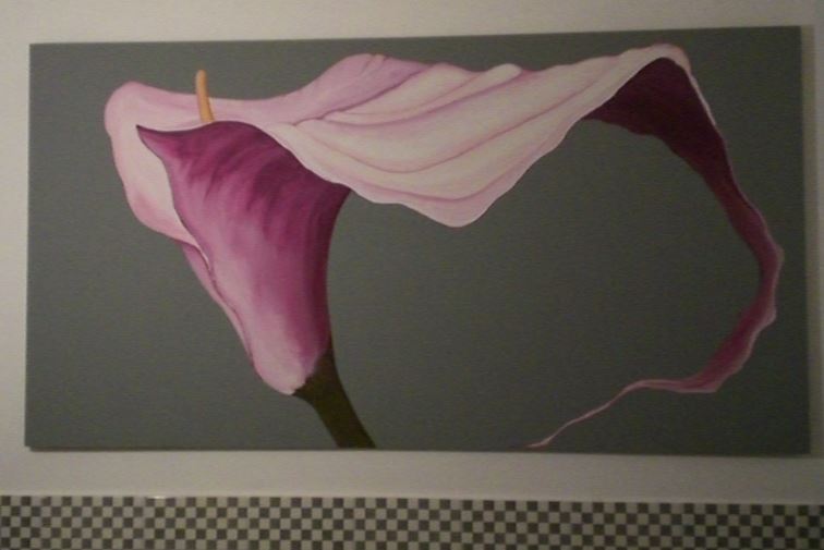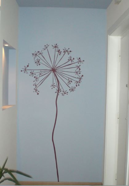 Un unico grande fiore dipinto invade la parete del bagno