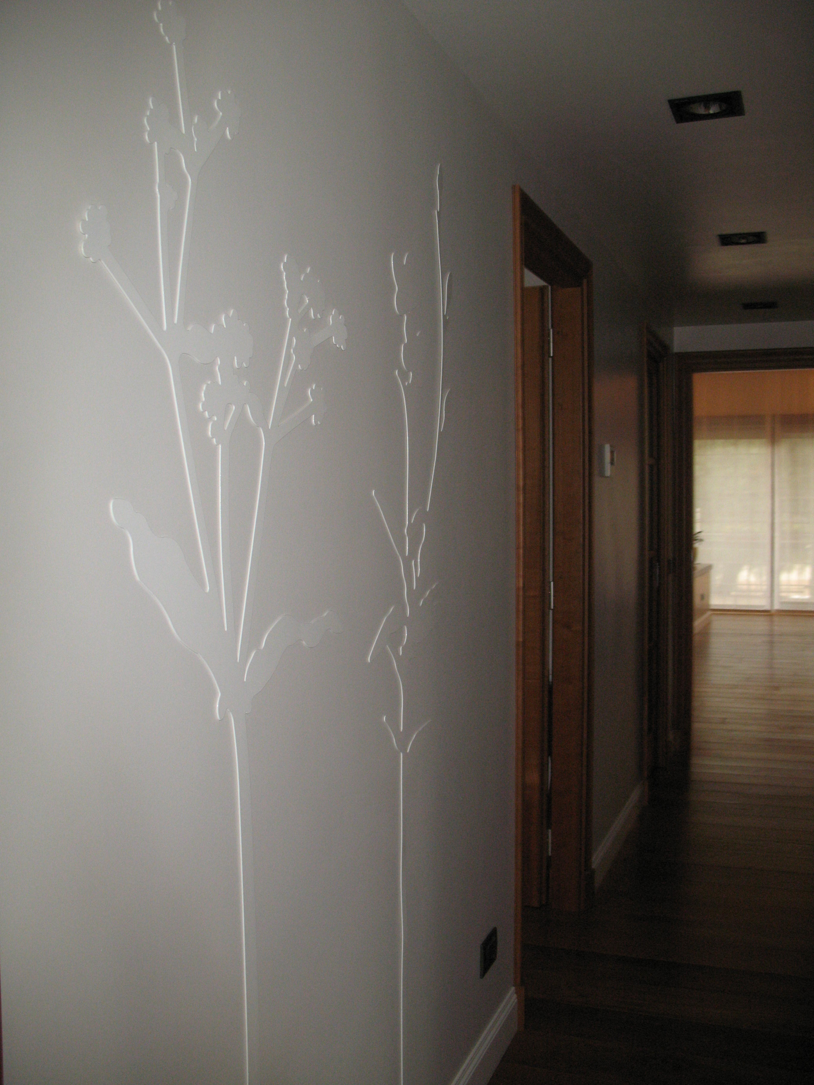 Fiori e steli stilizzati in acciaio sulle pareti del corridoio