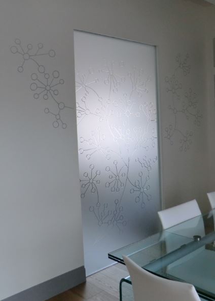 Il motivo inciso sulla porta di vetro, prosegue dipinto anche sulla parete