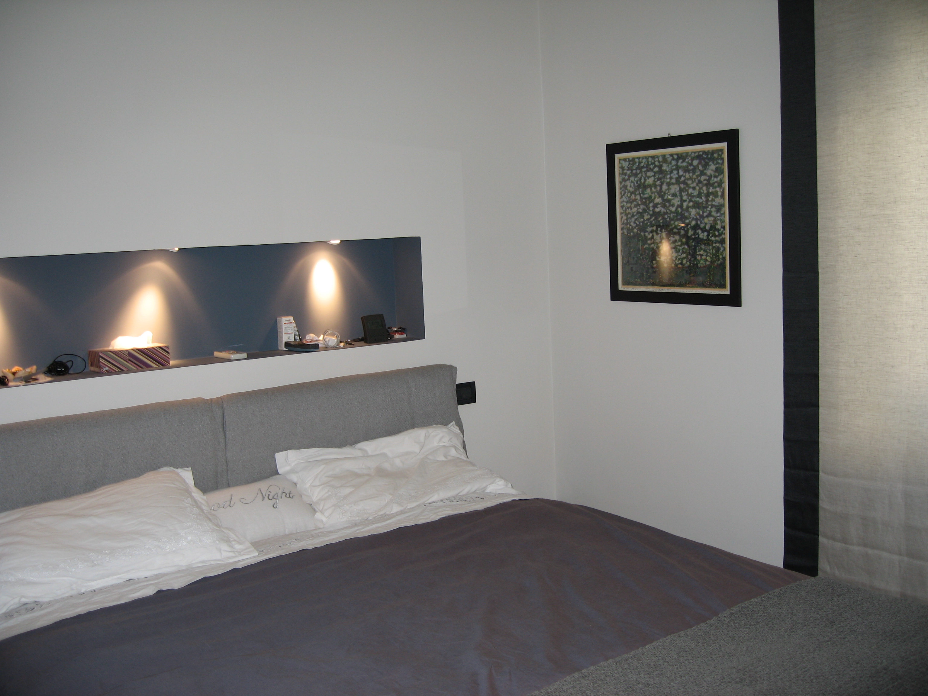 La parete della nicchia dietro al letto è colorata di blu e illuminata