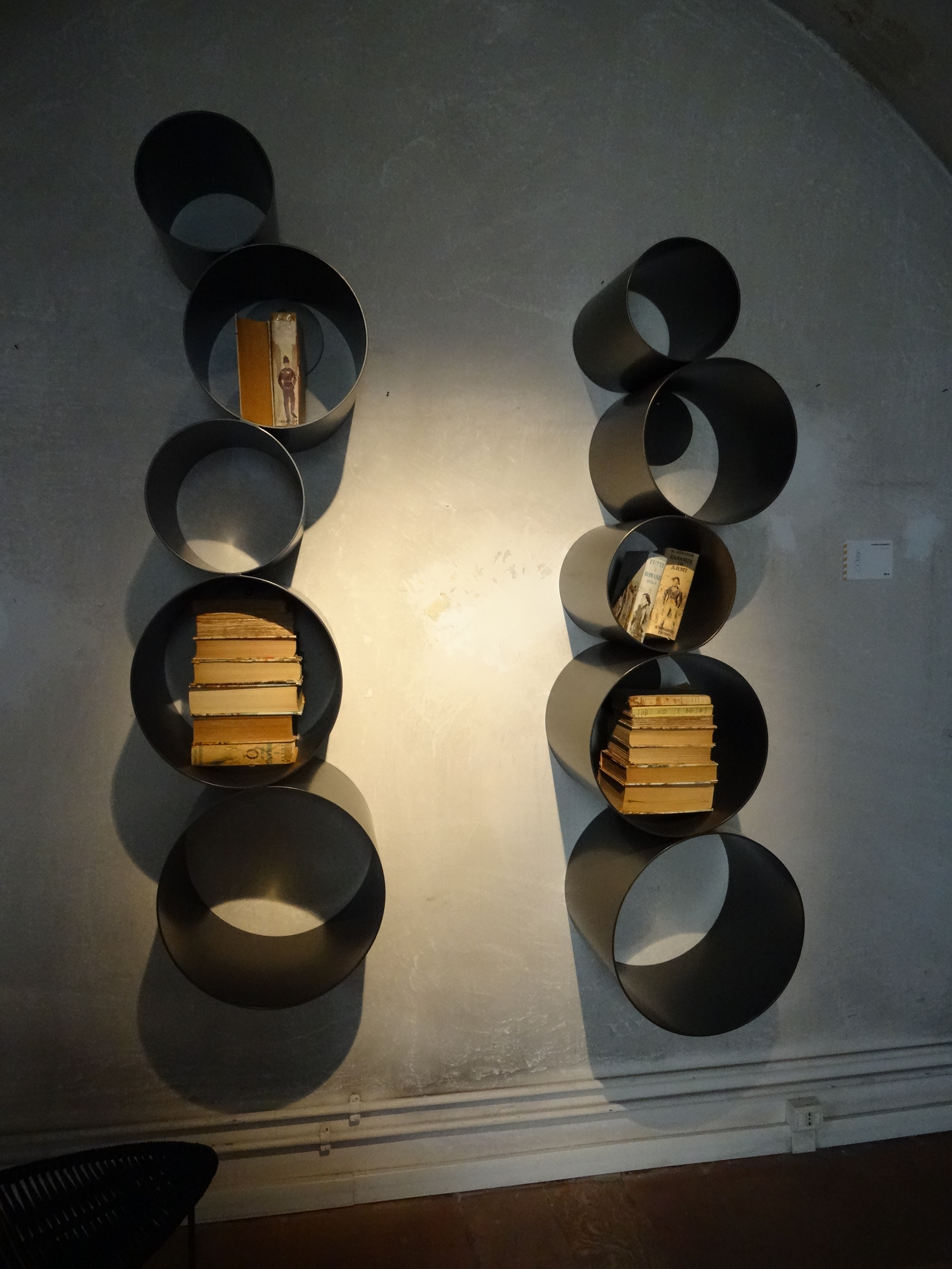 La libreria in metallo e il tavolo rivestito con polvere di pietra lavica sono prodotti dall’azienda leccese Da a che realizza complementi di arredo utilizzando i materiali dell’industria meccanica pesante