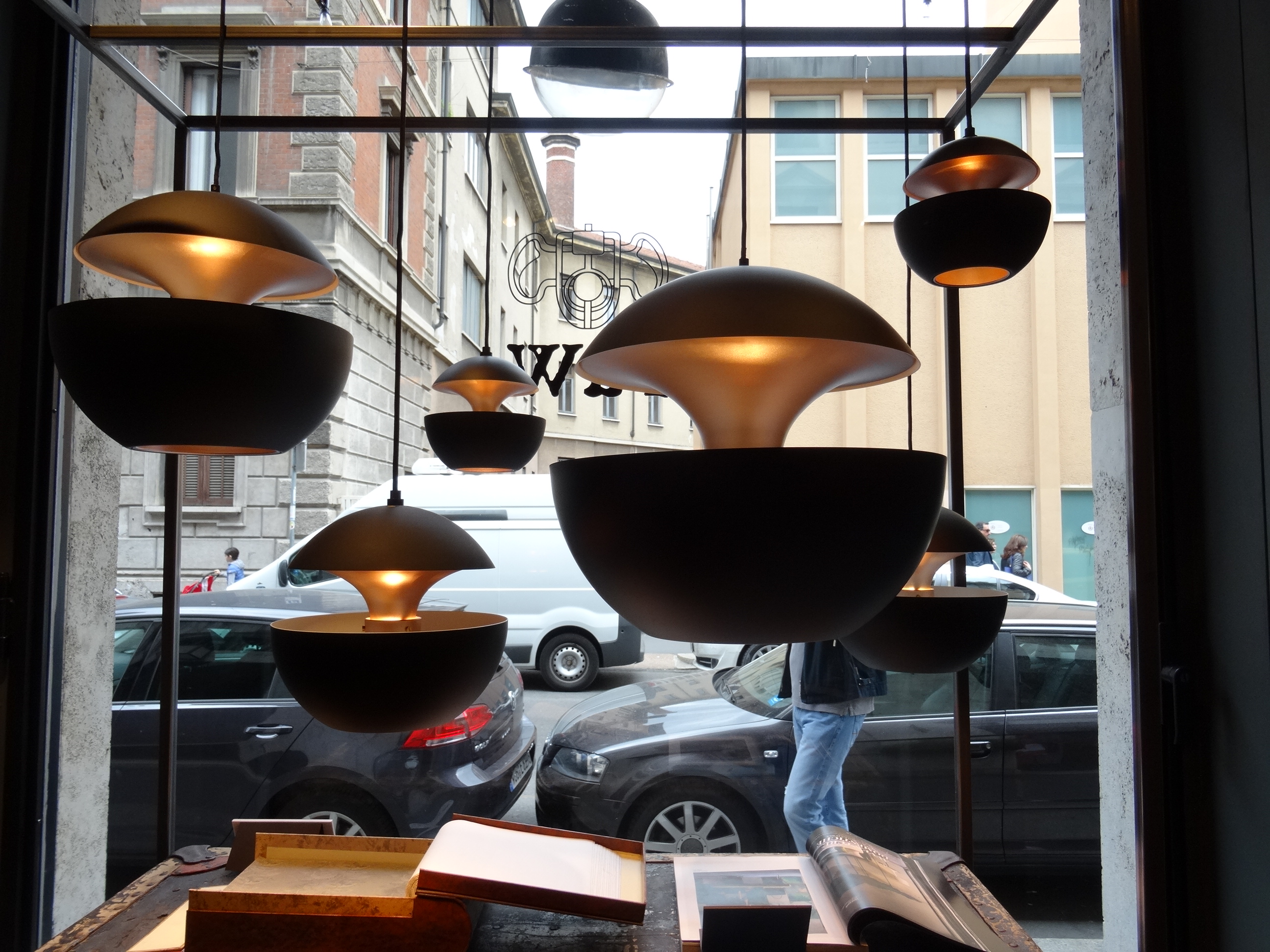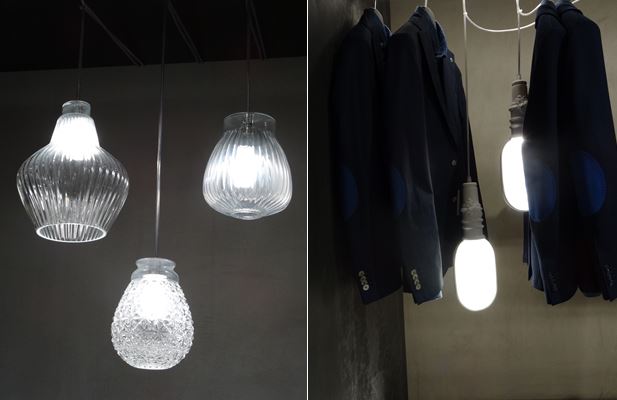 Lampade Karman in un allestimento presso la boutique Manuel Ritz di via Solferino