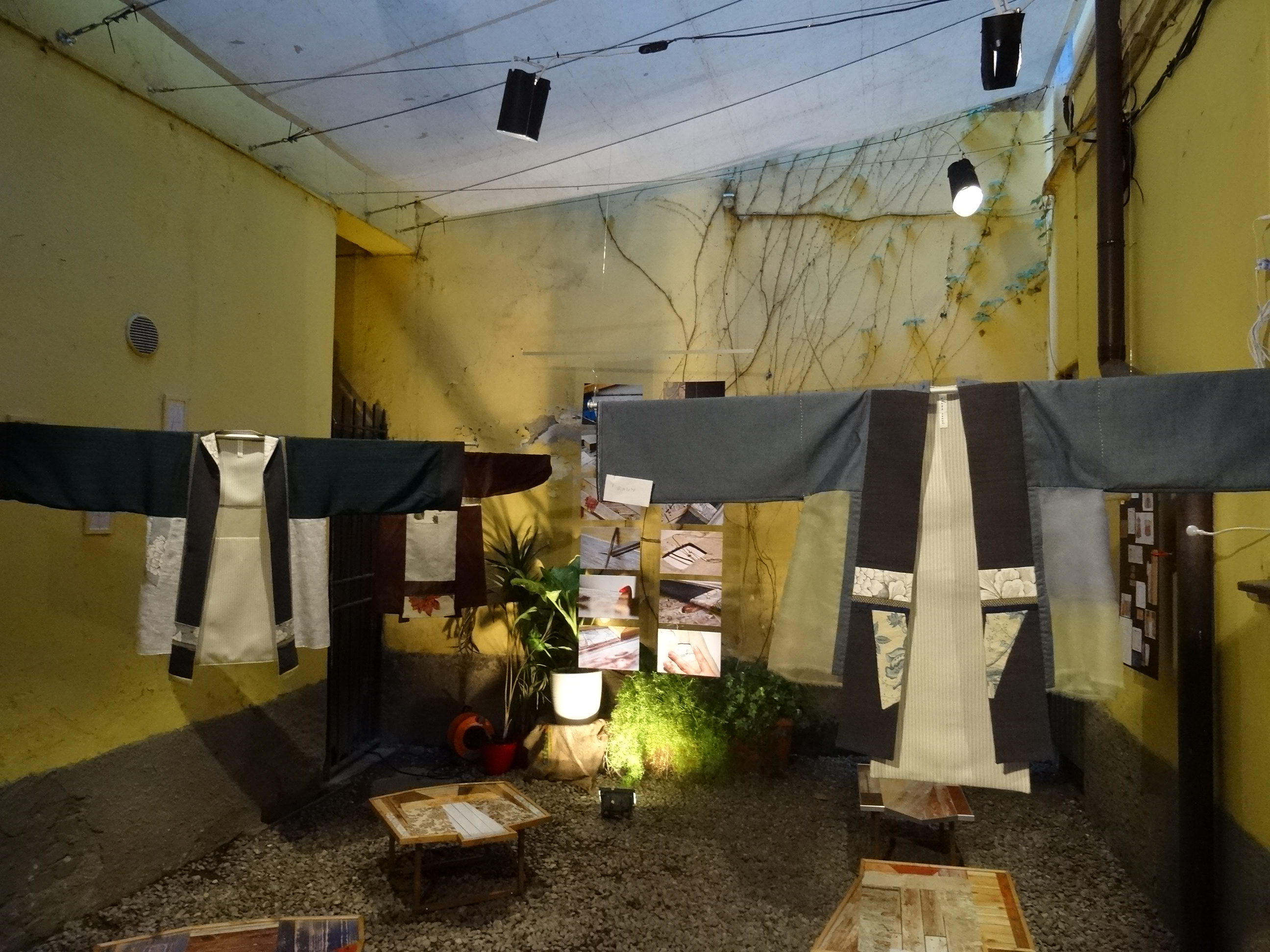 Chimono e tavolini di ispirazione Jap arredano un cortile di Tortona; sono ideati dalla texile artist Elena Rossi e dai designer di FreakyDot