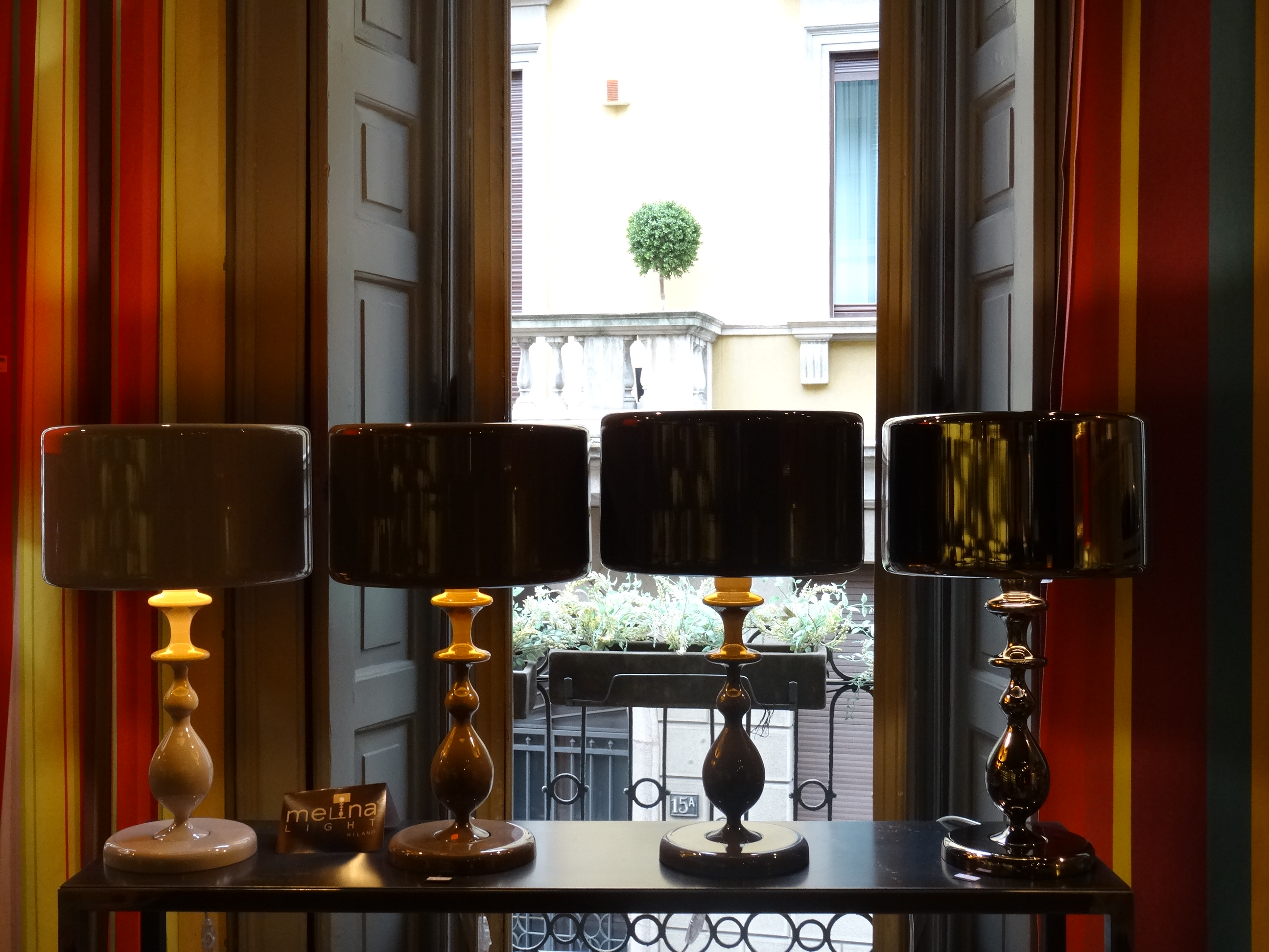 Finiture preziose ma anche colori pantone per le lampade Melina Light esposte nello show room Nella Longari di via Bigli