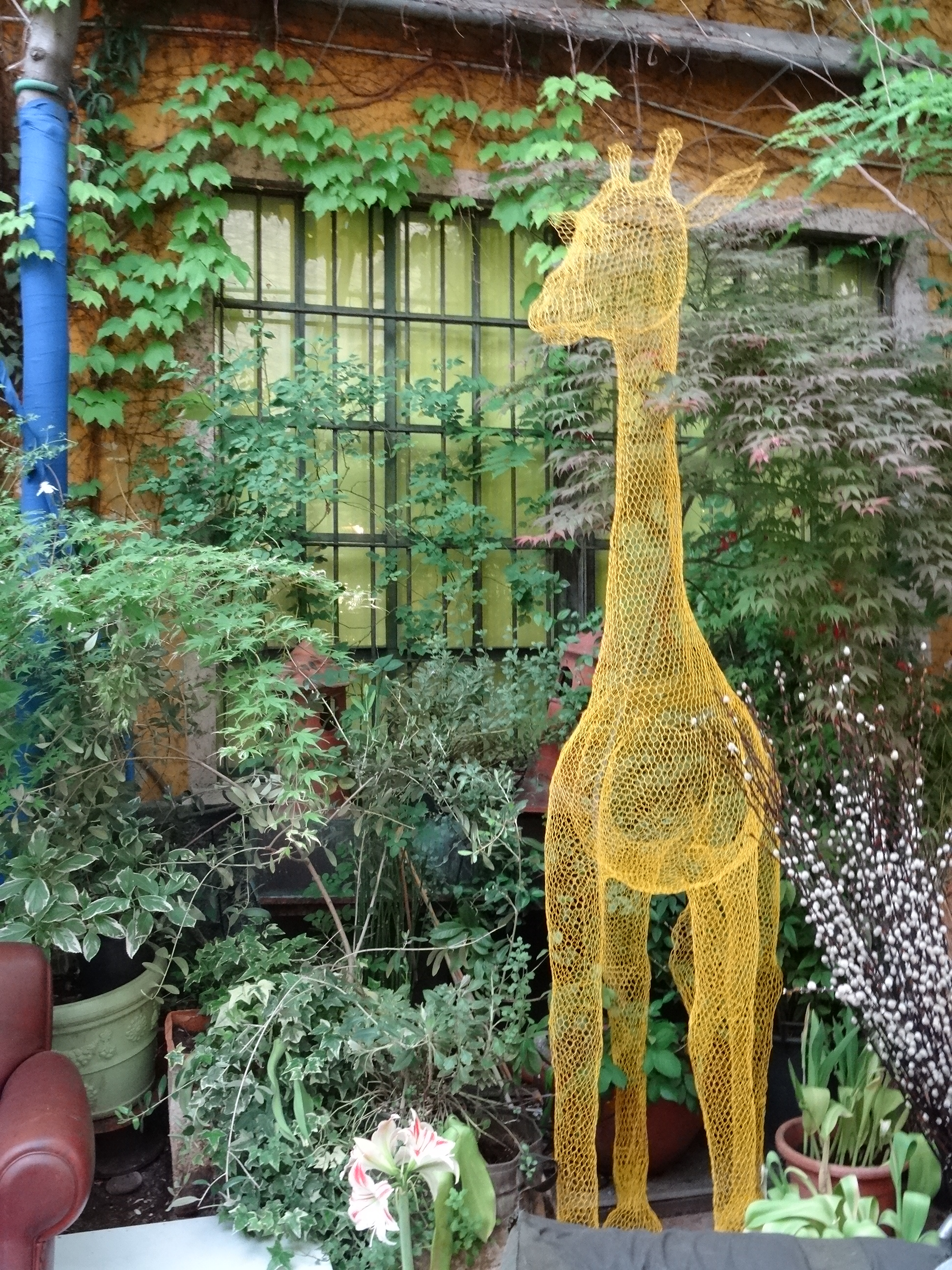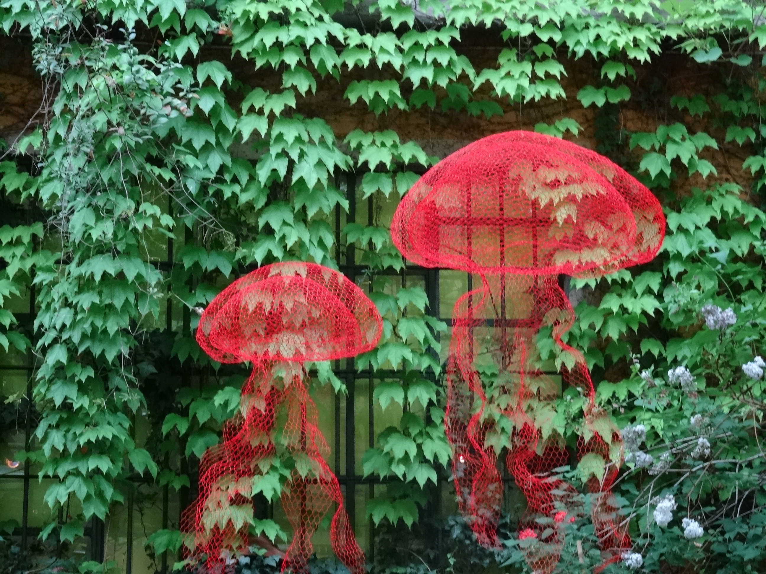 Meduse rosse e una giraffa in rete metallica nello spazio Rossana Orlandi in via Bandello