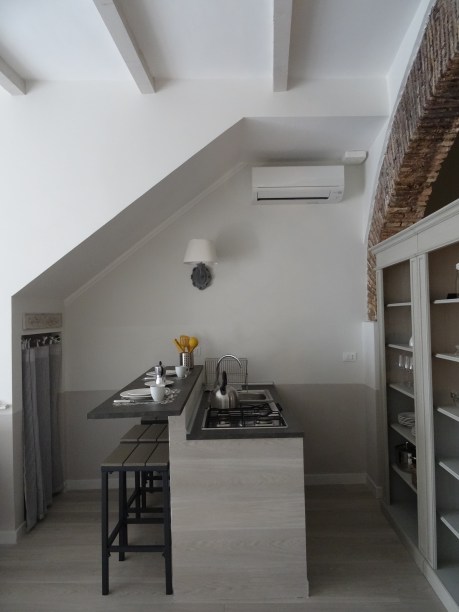 il vecchio angolo cottura è stato sostituito da un più moderno bancone a penisola e persino il bidet in bagno è stato sacrificato a favore di una doccia più spaziosa e agevole. Tanti piccoli accorgimenti accompagnati e sottolineati dal colore rendono questo piccolo loft allegro, accogliente e completo di ogni comodità.