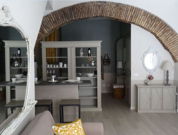 Piccolo ma collocato nel centro storico di Roma, a Trastevere, il monolocale ha cambiato completamente look: via i brutti pavimenti in gres beige; via il muro divisorio che nascondeva l’antico arco in mattoni tra zona giorno e zona notte;