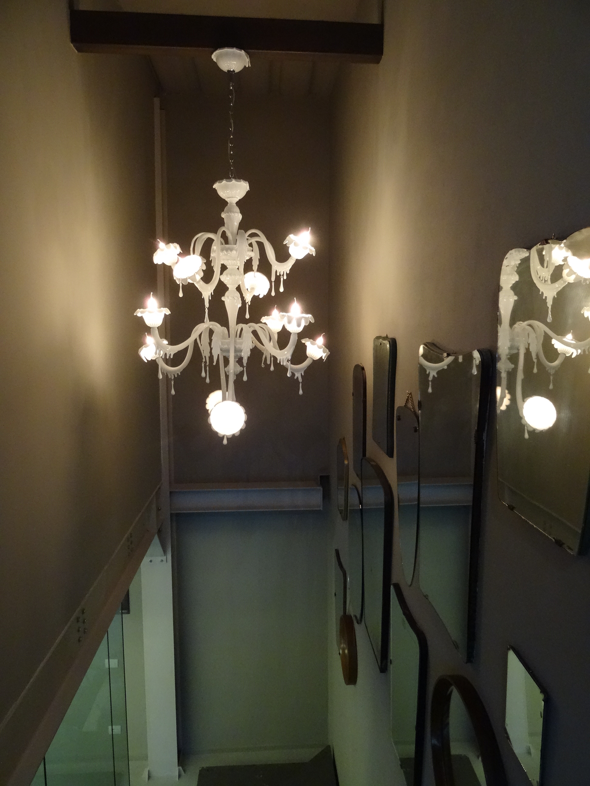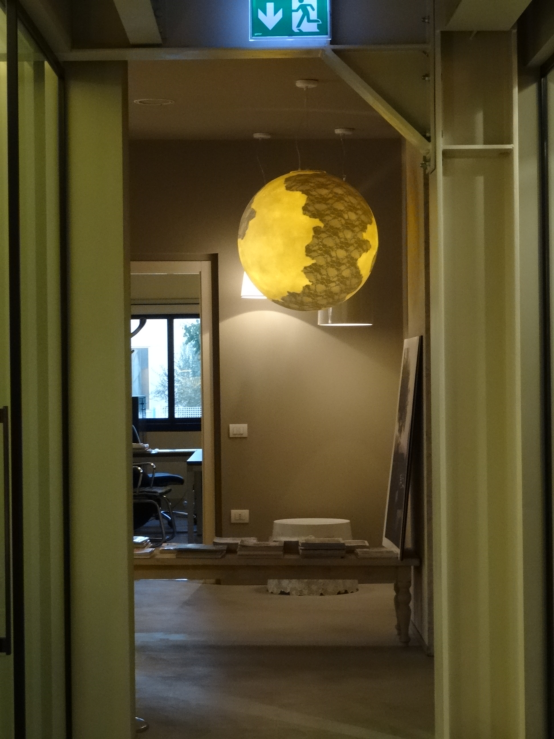 Il grande lampadario Au Revoir illumina la scala nella sede di Karman a Fossombrone (PU). Design Matteo Ugolini