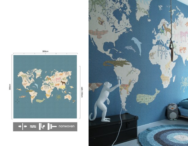 La carta da parati con l’immagine del globo terrestre è di Inke e riveste tutta la parete del letto