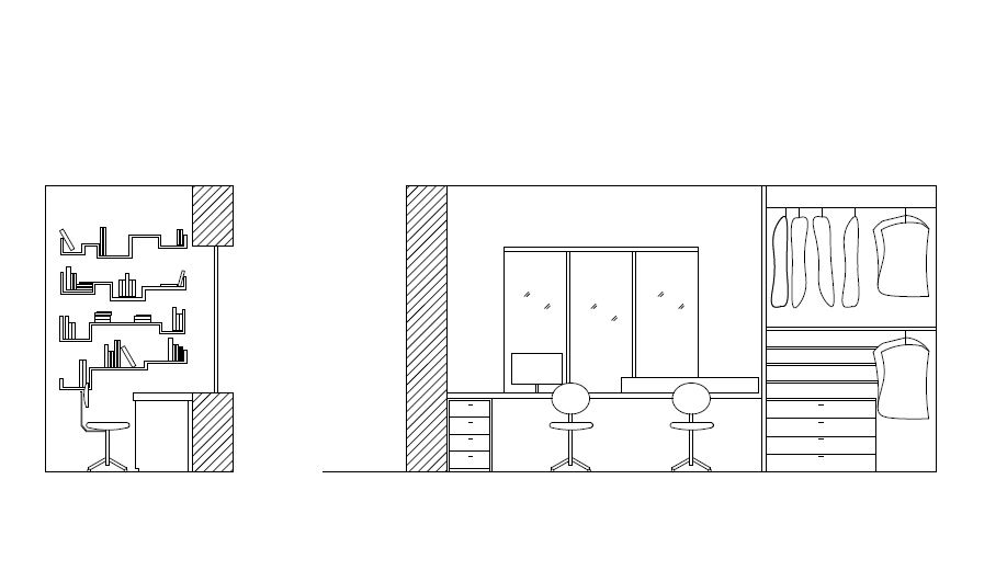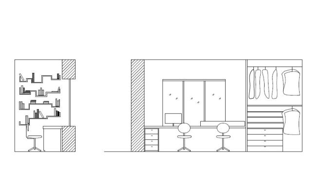 Planimetria della camera con gli arredi: la cabina armadio con la grande anta scorrevole è realizzata in falegnameria su due lati per sfruttare al massimo lo spazio a disposizione