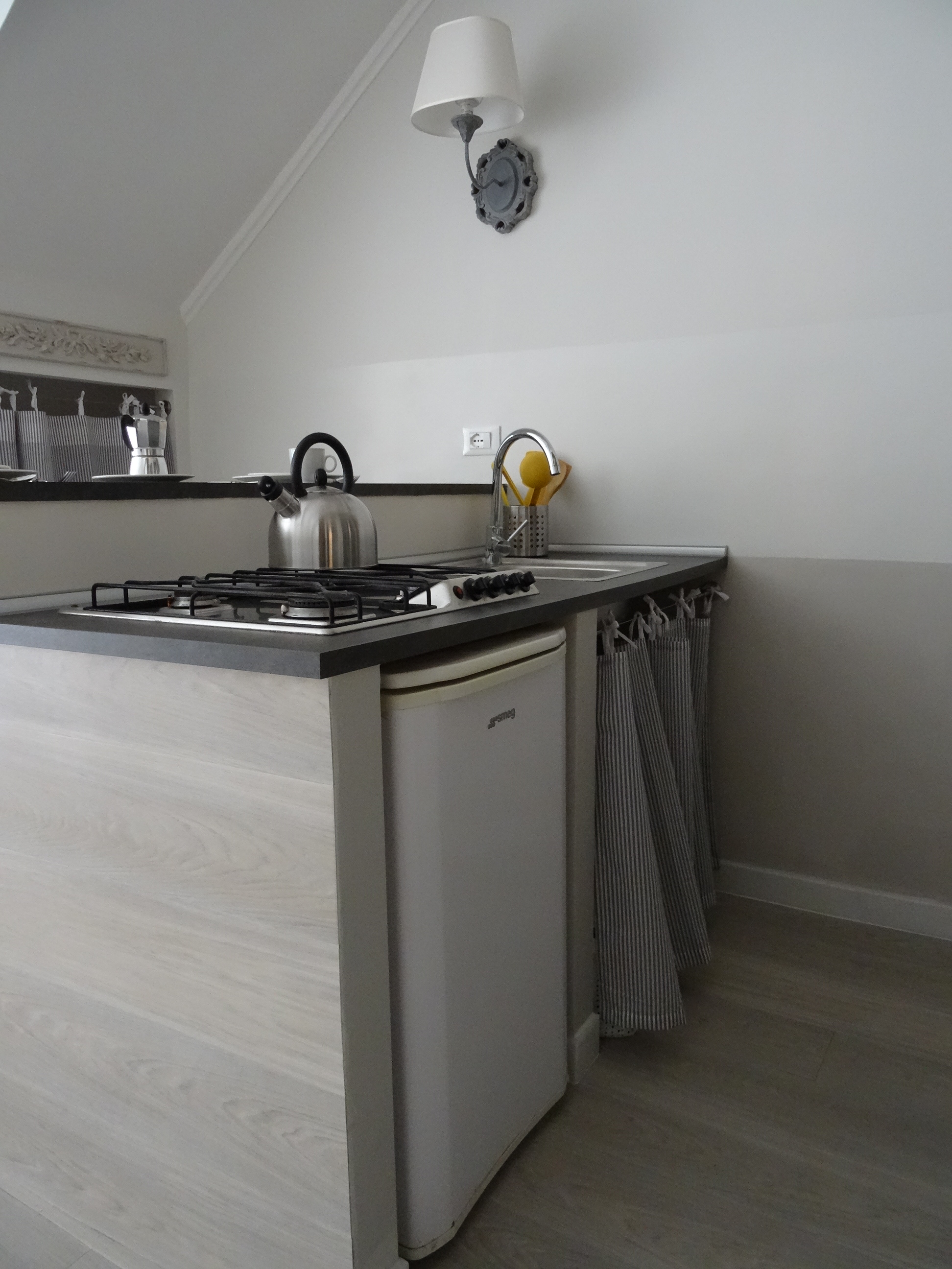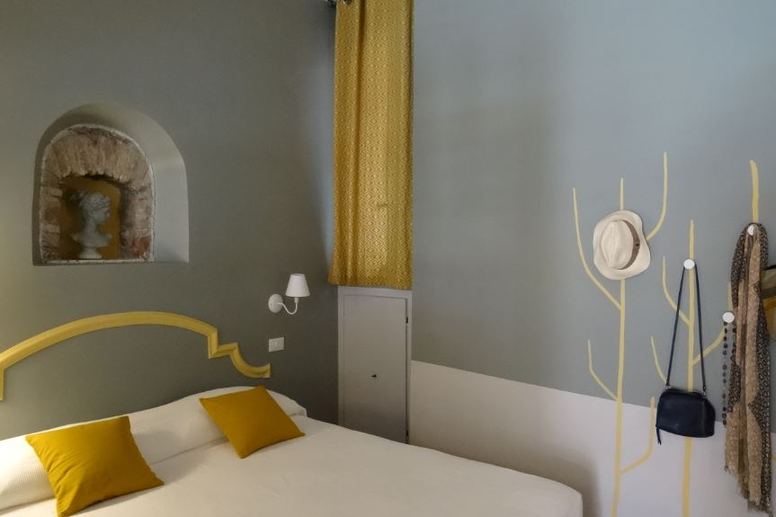 Small but located in the historic heart of Rome, in Trastevere, the studio has completely changed its look: the ugly beige floor tiles were removed as well as the partition wall that hid part of the ancient brick arch between the living area and the sleeping area connected through an antiquated plastic door; the old kitchenette was replaced by a modern peninsula and even in the bathroom the bidet has been sacrificed to create a more spacious and easy shower. So many small accents convoyed and highlighted by the colors make this small loft cheerful, cozy and very comfortable.